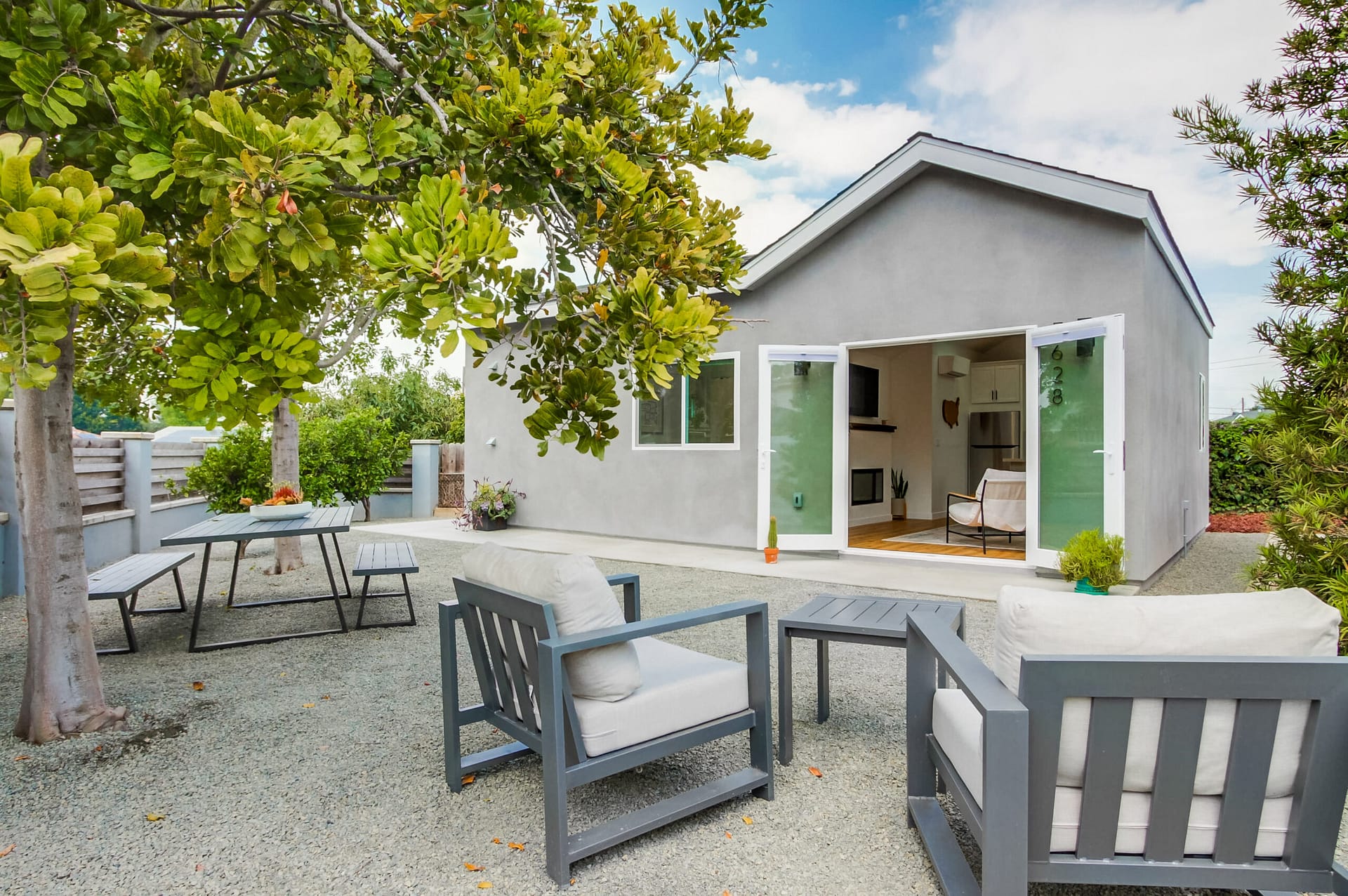 The large side yard allowed for creation of a private outdoor living area, isolated from the main house for a perfect rental.