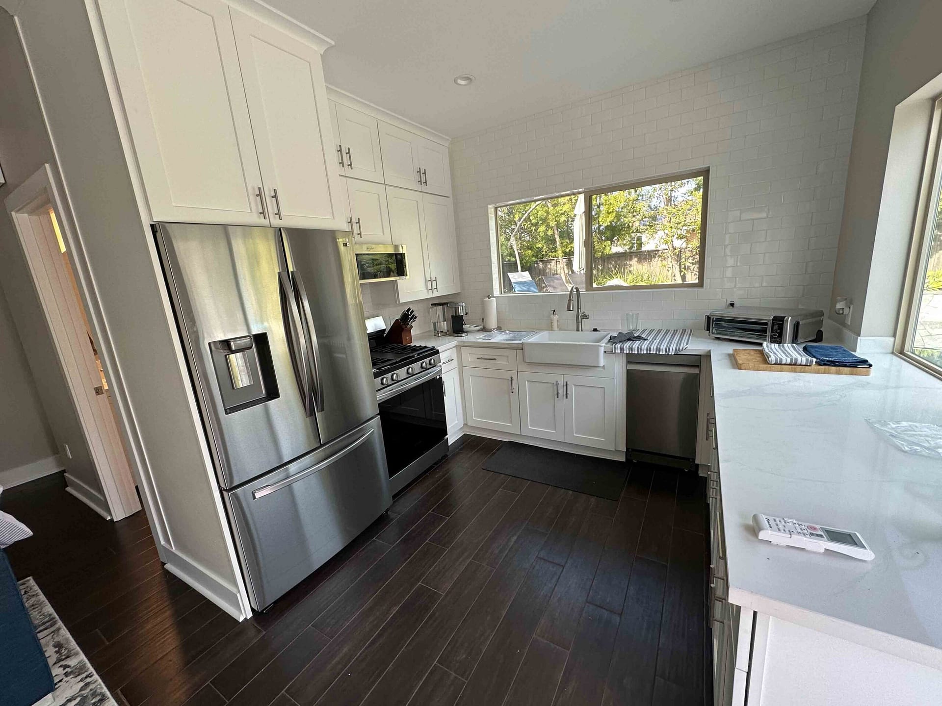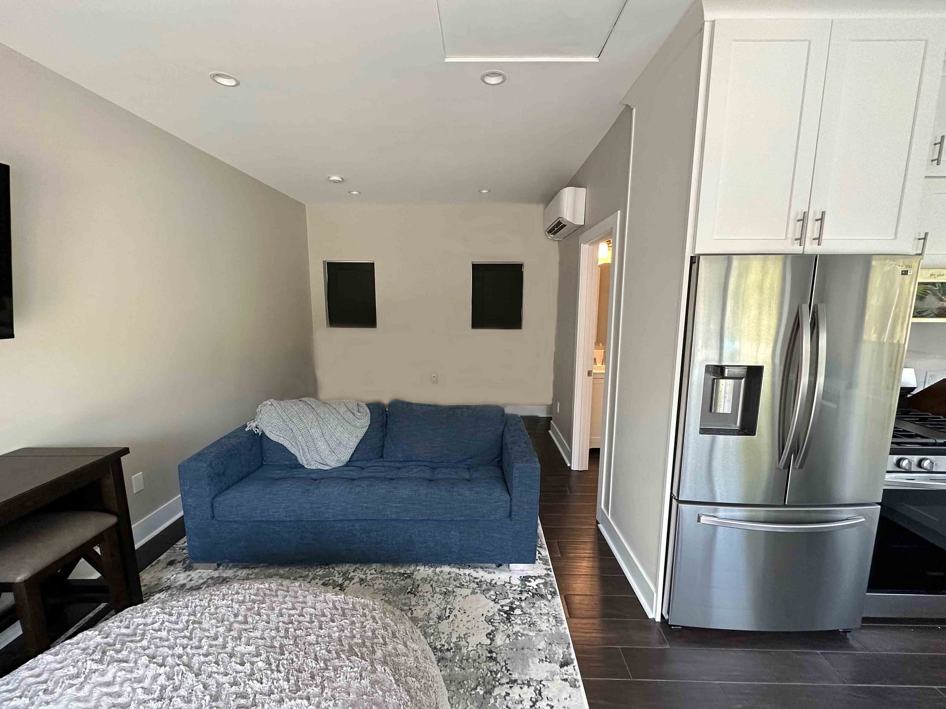 A small, efficient studio design for family visitors also serves as a pool house with La Cantina doors to open the space to the pool area.