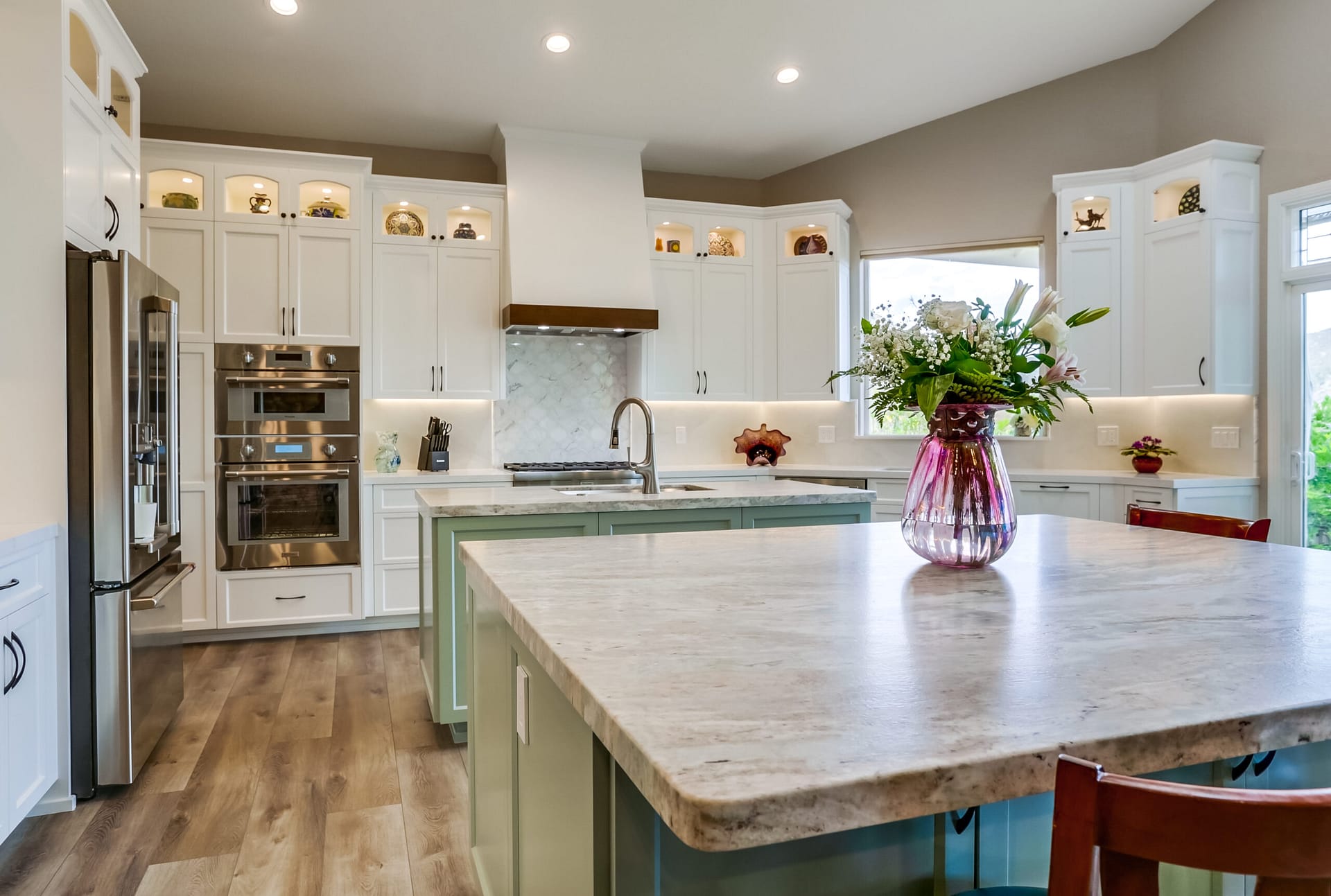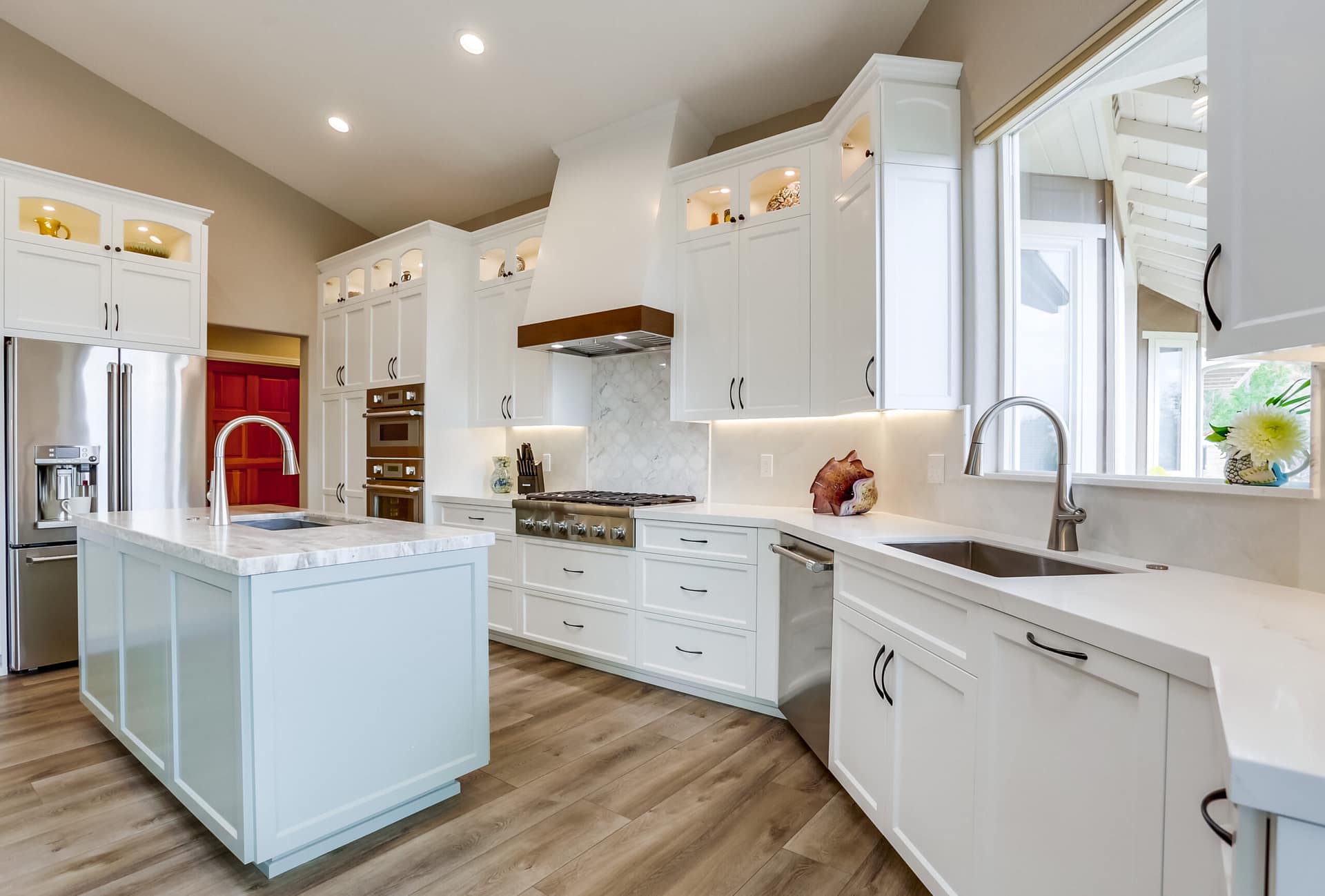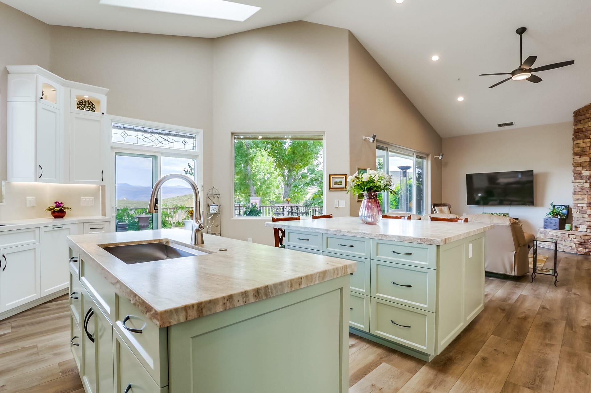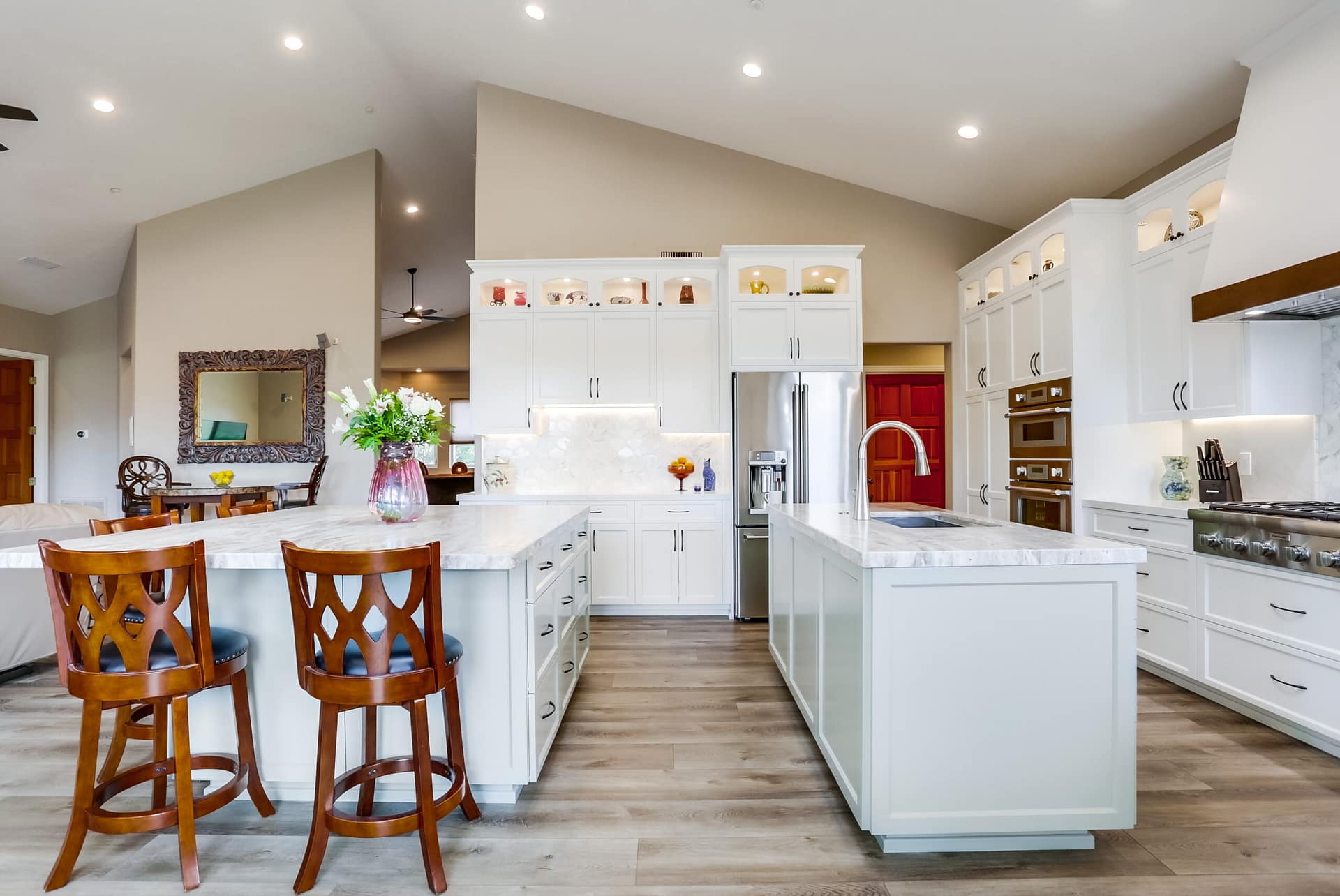 A full kitchen remodel adding a second kitchen island, full bath remodel, and flooring throughout the main areas of the home.