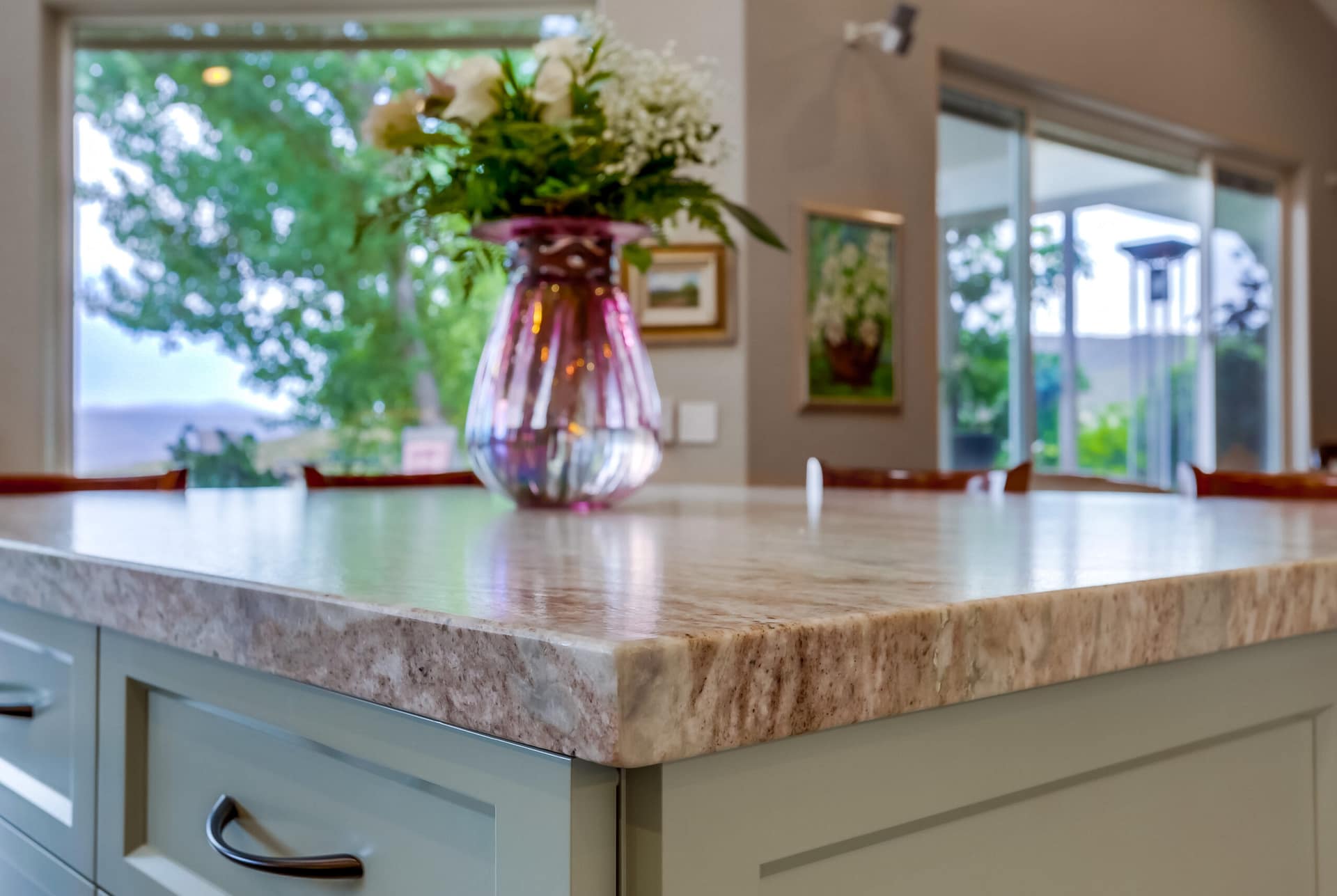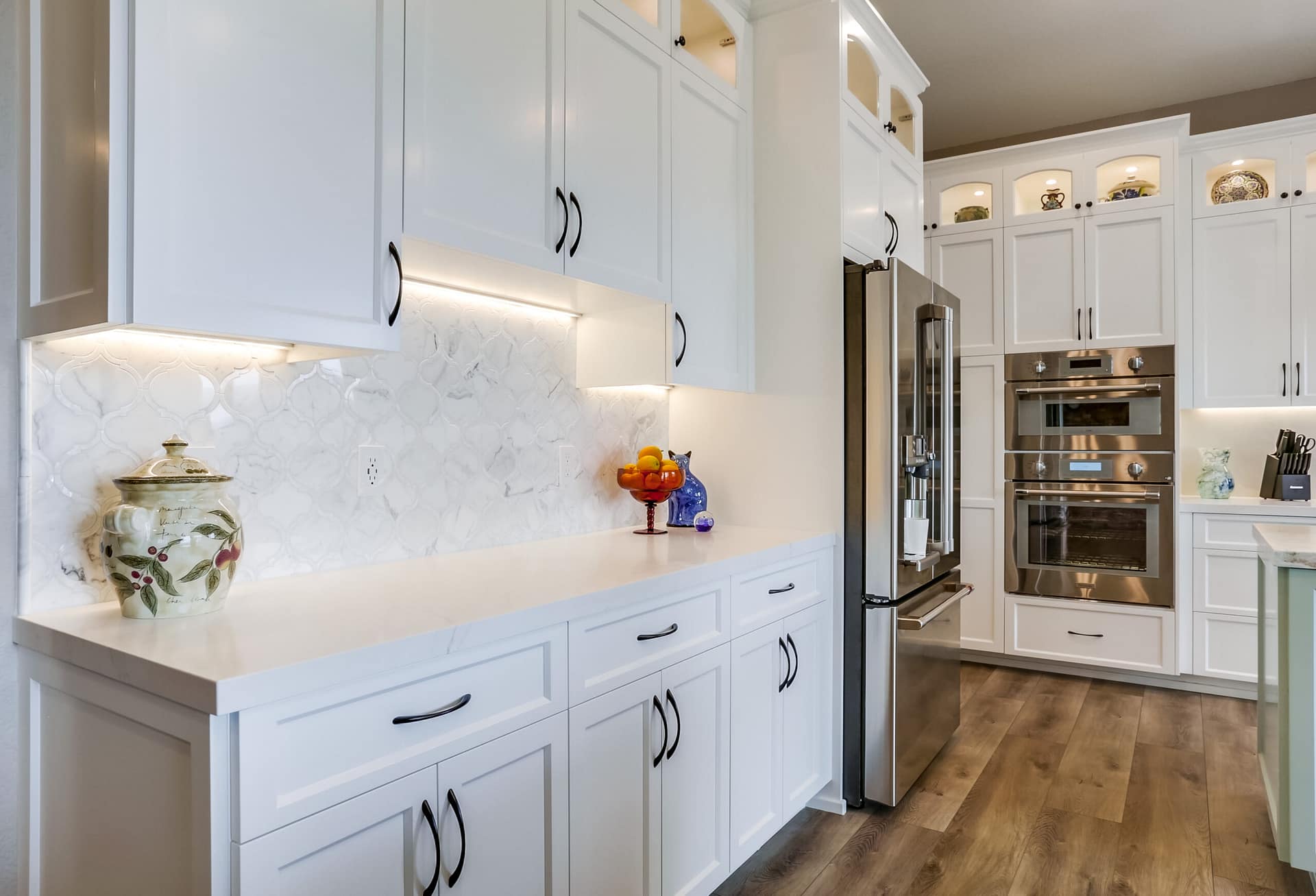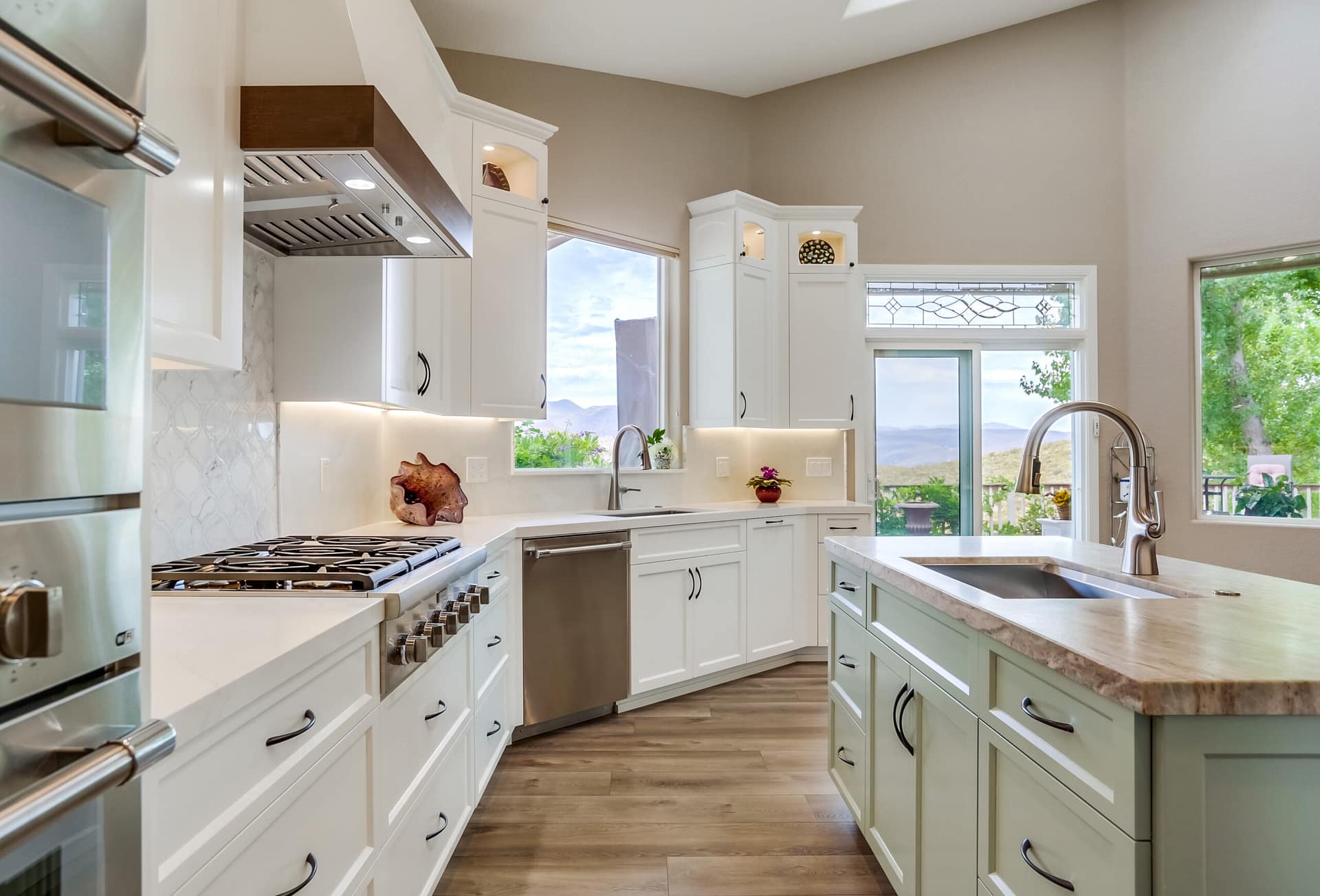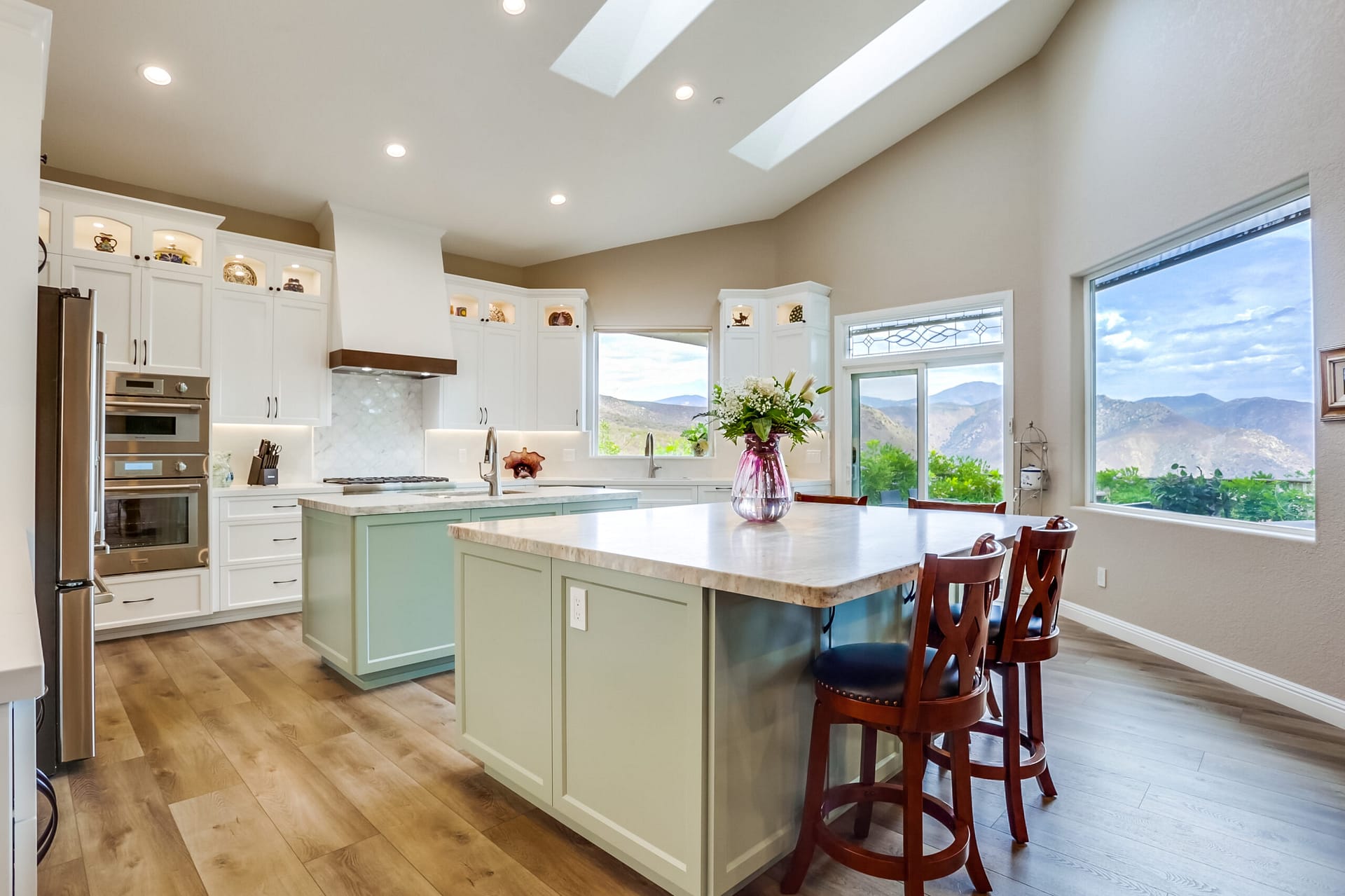 A full kitchen remodel adding a second kitchen island, full bath remodel, and flooring throughout the main areas of the home.